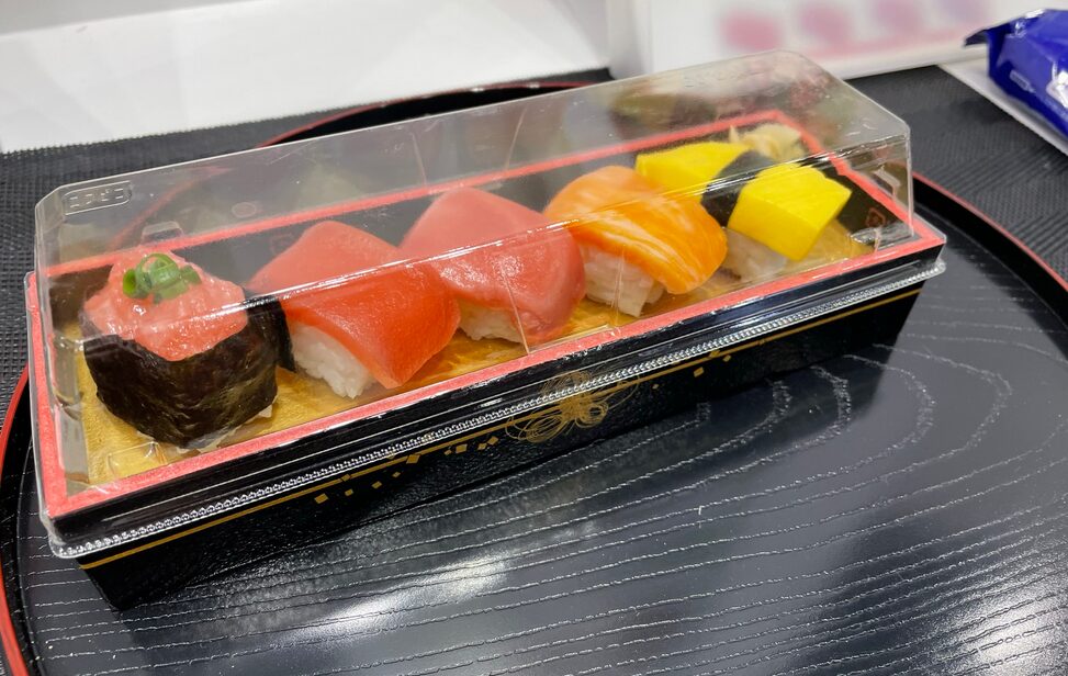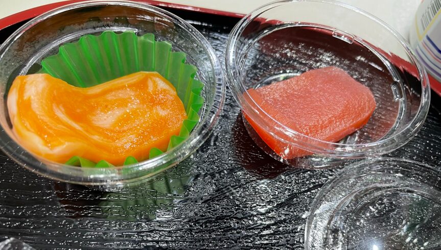 試食した植物性サーモンとマグロ Foovo(佐藤)撮影 2023年食品開発展にて