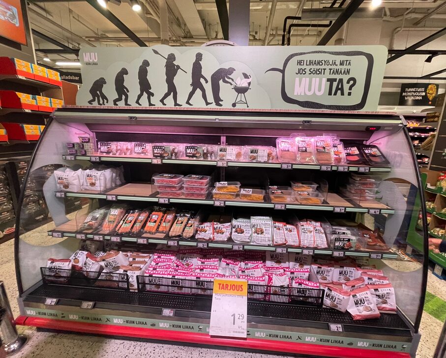 フィンランド・ヘルシンキの大型スーパーでは、特定の代替肉ブランドに特化した棚もあったほどである(下記写真)。