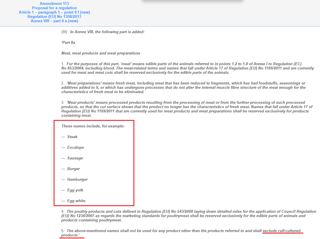 修正案113には例として、「ステーキ(Steak)」「エスカロープ(Escalope)」「ソーセージ(Sausage)」「バーガー(Burger)」「ハンバーガー(Hamburger)」「卵黄(Egg yolk)」「卵白(Egg white)」が列挙され、これらの名称を代替食製品で使用することを禁じる内容となっている。卵由来表現も保護対象となるほか、鶏肉の部位名の使用も禁止されている。