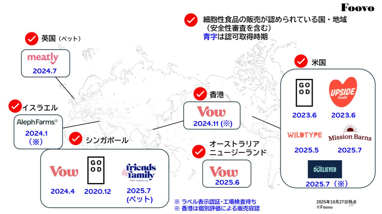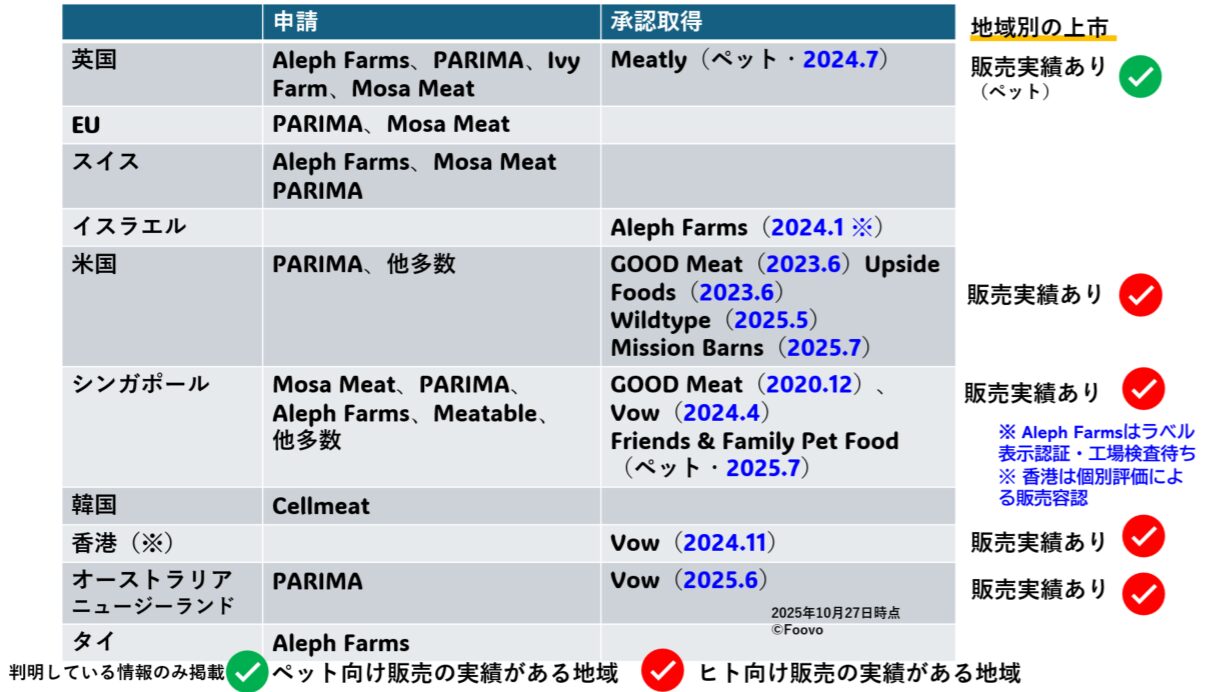 細胞性食品の認可状況(2025年10月27日時点) Foovo調査により作成