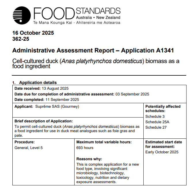 PARIMAが今月発表したFSANZへの申請(案件番号A1341)は、アヒル(Anas platyrhynchos domesticus)由来の細胞培養バイオマスをフォアグラやパテなどの製品原料として使用することを目的とするもの。申請は8月に受理され、最終承認は2026年8月末を目標に審査が進む。