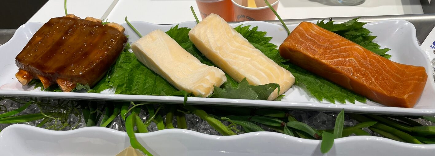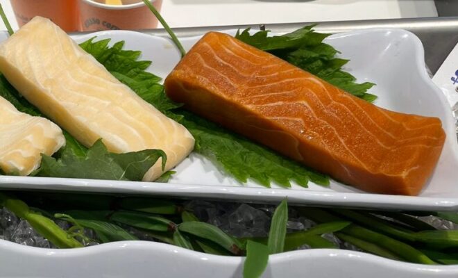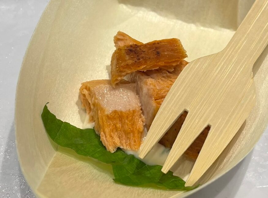 カナダ企業New School Foodsは、ジャガイモタンパク質、海藻エキス、DHA・EPA藻類油などを使用した植物性サーモンの展示・試食を実施した。