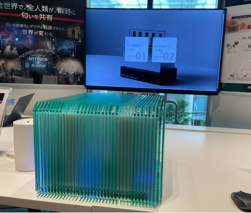 香味醗酵とNTTデータのブースでは、大阪・関西万博でも展示された「匂い再構成ディフーザー」が紹介された。大阪大学発ベンチャーの香味醗酵は、音声を伝送するように、匂いをデータとして届ける未来を構想している。
