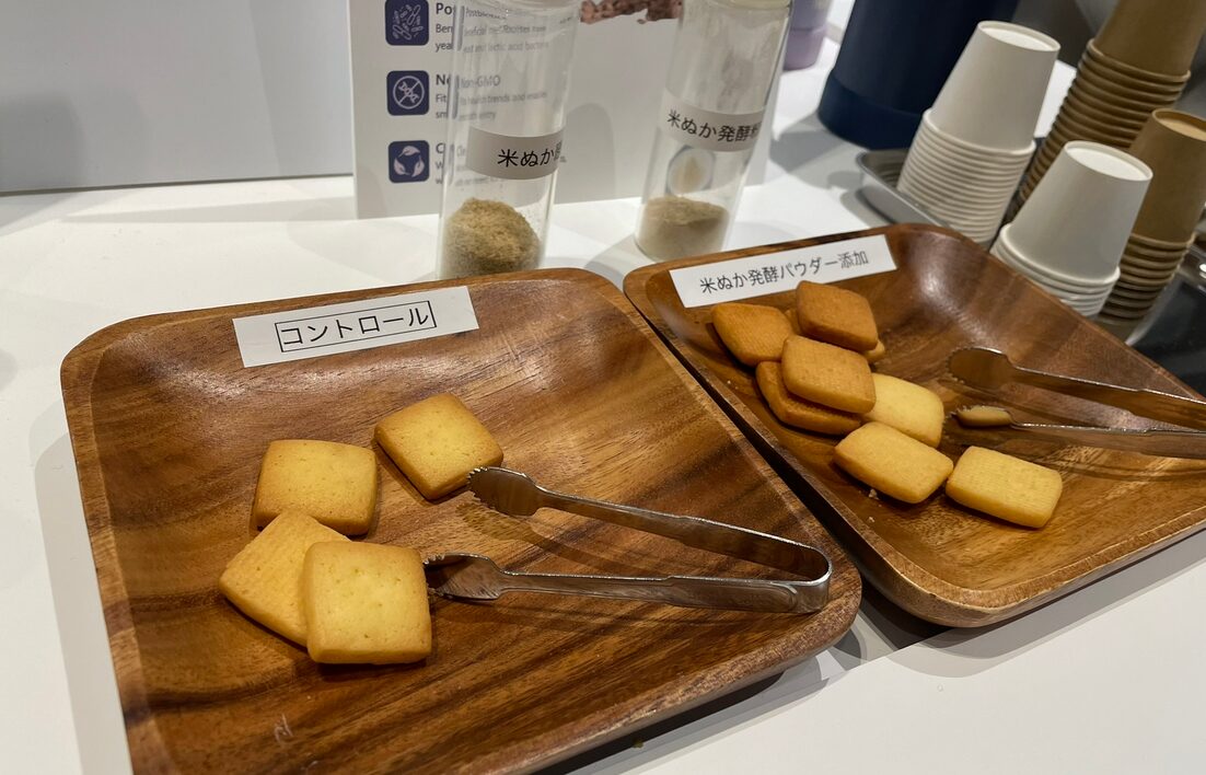 SKS JAPAN 2025の会場では、ゆずの皮やコーヒーかすを活用したアルコールフレーバー、米ぬかを複数の微生物で発酵させた風味パウダーを添加したクッキーの試飲・試食が行われた。米ぬか発酵パウダー入りのクッキーは、コントロールで感じた独特の匂いが抑えられ、よりまろやかな味わいに仕上がっていた。