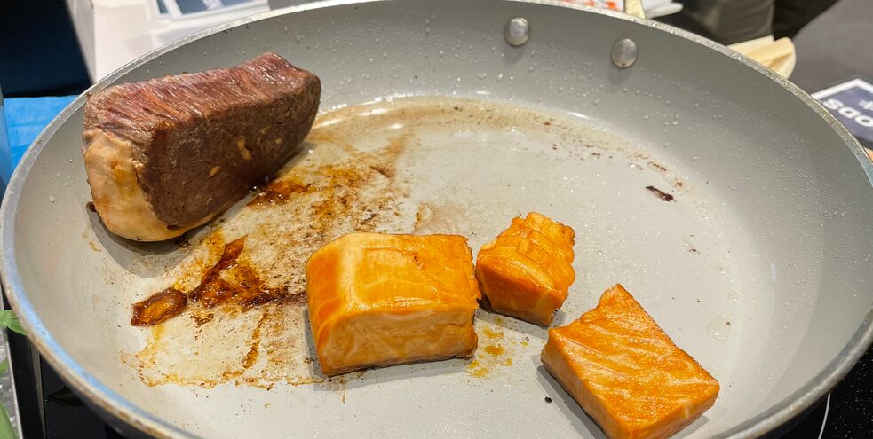 6月には新たにNS/TX Industriesを設立し、New School Foods独自の指向性凍結技術を用いてステーキや植物性骨付きリブなど、ホールカットの代替赤身肉を開発することを発表した。会場では植物性サーモンのほか、白身魚や厚みのある骨付き肉の代替品も展示された。