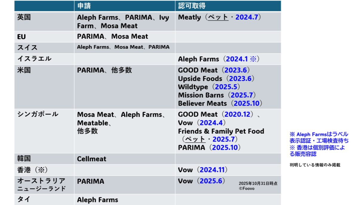 ▼細胞性食品の認可・申請状況まとめ(Foovo調査/2025年10月31日時点)