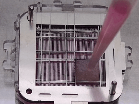ネットモールド法は、網を組み合わせた鋳型に細胞塊を流し込み、細胞塊が網に引っかかった状態で培養することで、細胞が増殖・結合し、大きな塊として形成される仕組みだ。最終的にくし状の鋳型を引き抜くことで、細胞100%で構成される培養肉が生成される。細胞同士をつなげる結合剤を必要としない点が特徴だ。