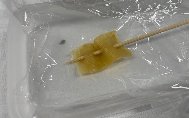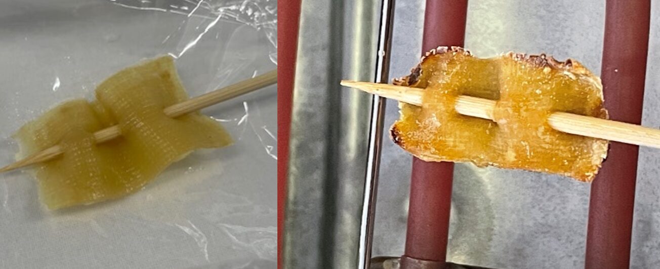 現在は5cm×5cmのネットモールドを使用しており、会場では1mm厚に培養した細胞性鶏肉を4枚重ねた試作品が展示された(上記)。実際に触ると、柔らかくしなやかな弾力が感じられた。