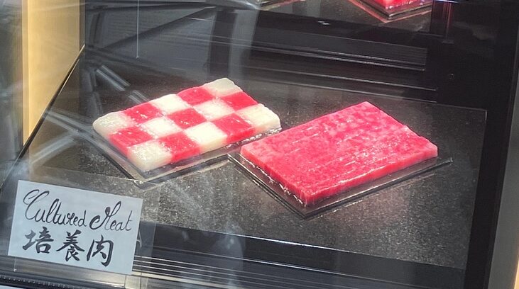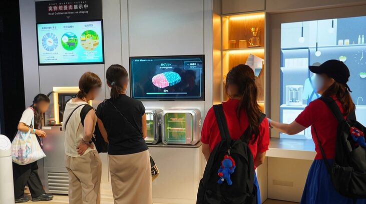2025年4月13日から半年間開催された万博の大阪ヘルスケアパビリオンでは、「家庭で作る霜降り肉」ブースが設置され、培養肉の実物が展示された。