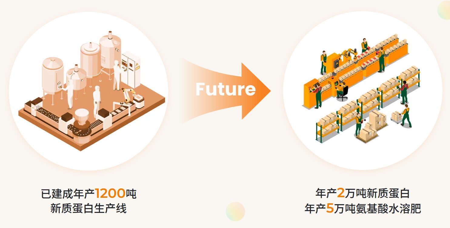 現在、年産20万トン規模の「マイコプロテイン・資源総合利用プロジェクト第1期」を進めており、第1期が完成後は、マイコプロテインで年産2万トン、アミノ酸水溶性肥料で年産5万トンの生産規模を見込む。