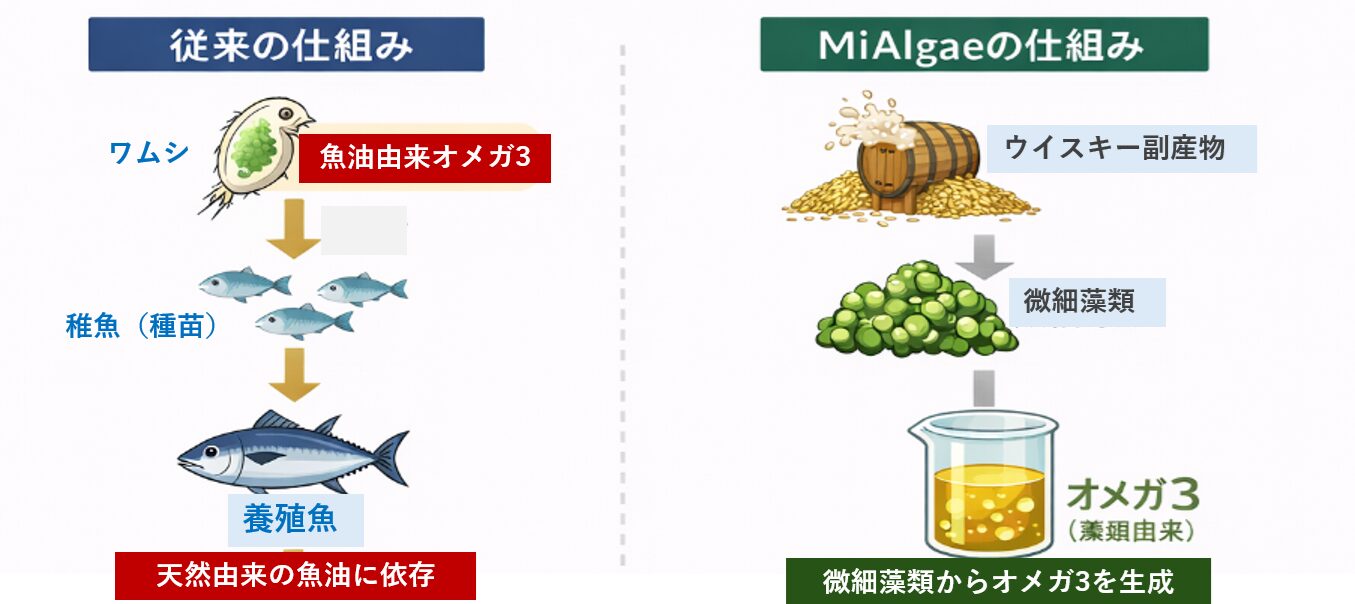 ウイスキー副産物を処理するだけでなく、それを有用物質に変換するMiAlgaeの技術は、廃棄物処理の負荷を下げると同時に、魚油依存の低減を通じて養殖向けオメガ3脂肪酸の供給を安定化させるという、二つの価値を併せ持つ。