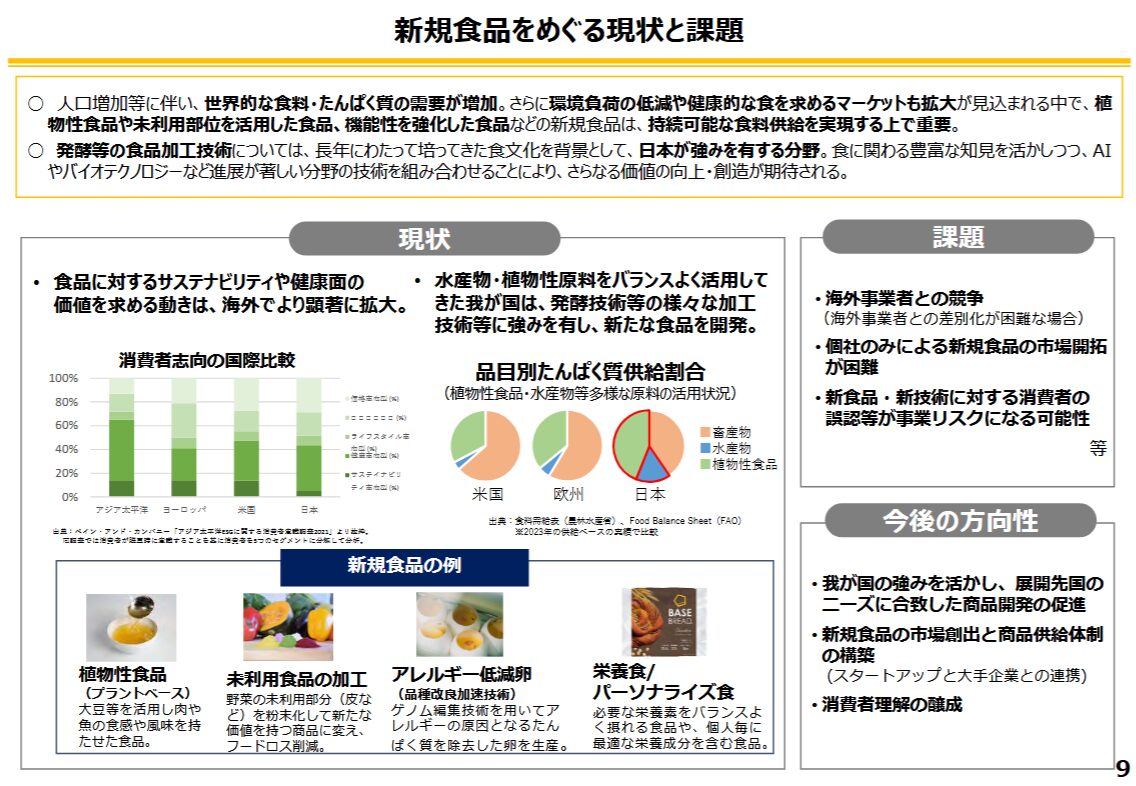 第1回フードテックWGの資料3によると、「新規食品」の例として想定されるのは、植物性食品、未利用食品の加工、アレルギー低減卵、栄養食/パーソナライズ食など。初回資料の記載範囲では、培養肉などの細胞性食品は例に含まれておらず、植物性食品・未利用資源を活用した食品・機能性を強化した食品などが前面に置かれていることがうかがえる。