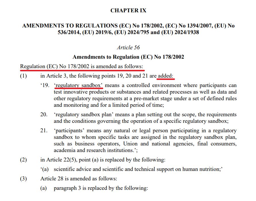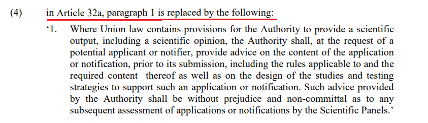 具体的には、①一般食品法のArticle 32aを差し替え、EFSAが研究設計や試験戦略についての申請前の事前アドバイスを行うことが明記(p8,114)され、②規制サンドボックス制度(Article 49a/p115)が追加されている。