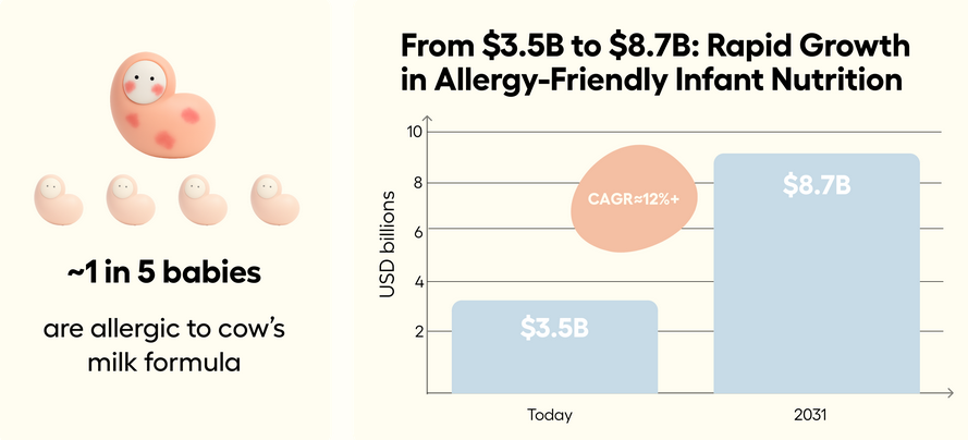 同社は現在、アレルギーのある幼児(Toddler)を対象に、母乳成分から着想を得たアレルギー対応粉ミルク製品「Melodi」から市場投入を目指している。「Melodi」は母乳にある成分と似た成分を約50%使用し、従来のアレルギー対応製品ではそれが3%未満にとどまるという。