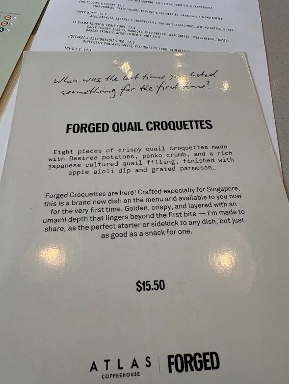 FORGEDとはなんぞやの説明もメニューに挟まれた形で用意がされていた(下記写真)。15.5シンガポールドル(約1860円)はクロケット約6個分の値段となる。