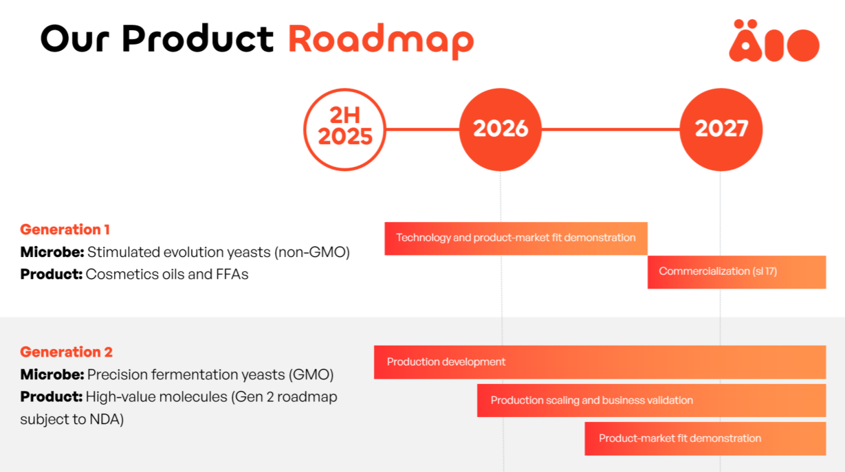 同社公表資料によると、まず非GMO酵母を用いた化粧品向け油脂・遊離脂肪酸の商用化を進め、次の段階としてGMO酵母による精密発酵で高付加価値分子(詳細は非公開)の開発を進めるとしている(上記資料)。