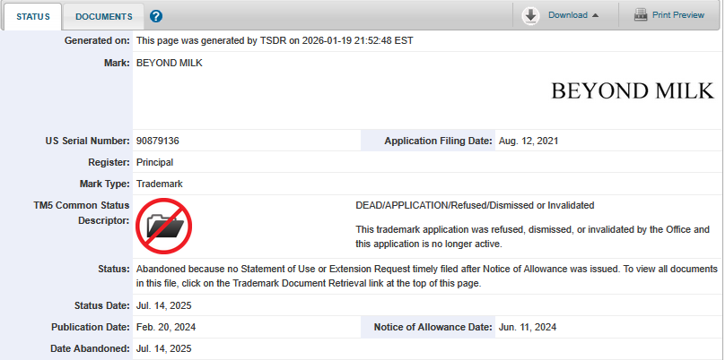 その後、「ビヨンドミルク」は期限内に必要書類が商標庁に提出されず、放棄となった。