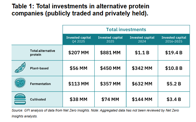 Good Food Institute(GFI)の発表によると、2025年に代替タンパク質企業に集まった年間投資額は8億8,100万ドル(約1,360億円)となり、2024年の11億ドル(約1,700億円)から約2割の減少となった。