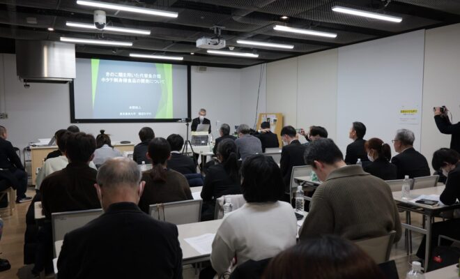 東京農業大学醸造科学科の本間裕人准教授は、先月31日に開催された「きのこ研究部会」ワークショップで、エリンギを用いた代替ホタテ貝柱の研究内容を発表した。