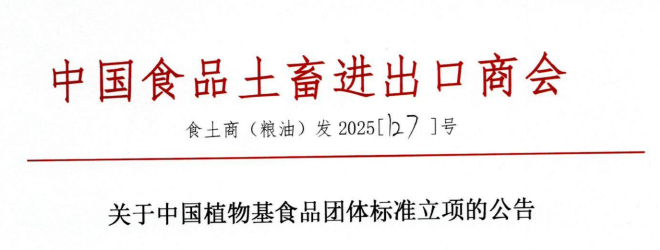 中国食品土畜進出口商会(CFNA)は2025年12月1日、「中国植物性食品団体標準(中国語:中国植物基食品团体标准)」の策定を進めることを正式に発表した。