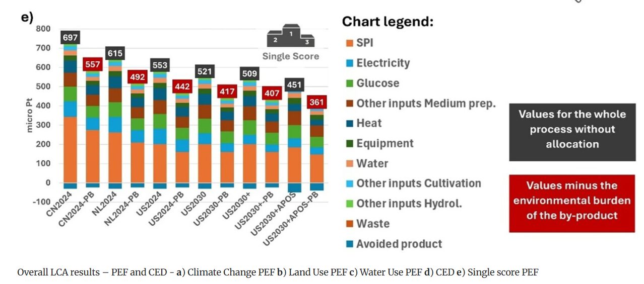 論文によれば、PEFシングルスコアへの寄与が最も大きいのは大豆タンパク質分離物(SPI)で、全体の35〜45%を占める。次いでグルコースが続き、電力・熱などが合計で21〜26%を占めた。