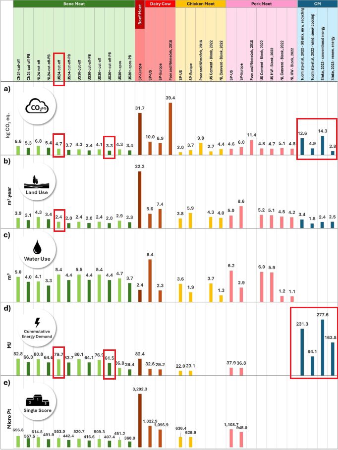 培地に米国産の大豆タンパク質分離物(SPI)を使用し、2024年のチェコ電力構成を適用した場合、これまでの細胞性食品LCAと比較して、累積エネルギー需要(CED)は大幅に低く、温室効果ガス排出量も公表済みの脱炭素化シナリオと比べて同程度か、さらに低い結果となった(温室効果ガス排出量は4.7kg CO2換算、土地利用は2.4m²、水需要は0.16m³、累積エネルギー需要は79.7MJ)。