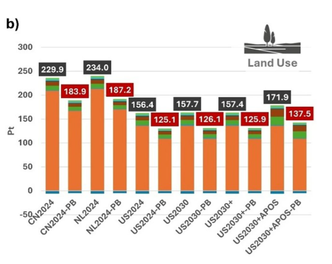 その結果、米国産大豆たんぱく分離物・2030年以降のチェコ電力構成・cut-offのシナリオ「US2030 + cut-off」では、総合指標であるPEF(Product Environmental Footprint)シングルスコアが、欧州産鶏肉より35%、欧州産豚肉より57%、欧州産乳牛より63%低い結果となった。