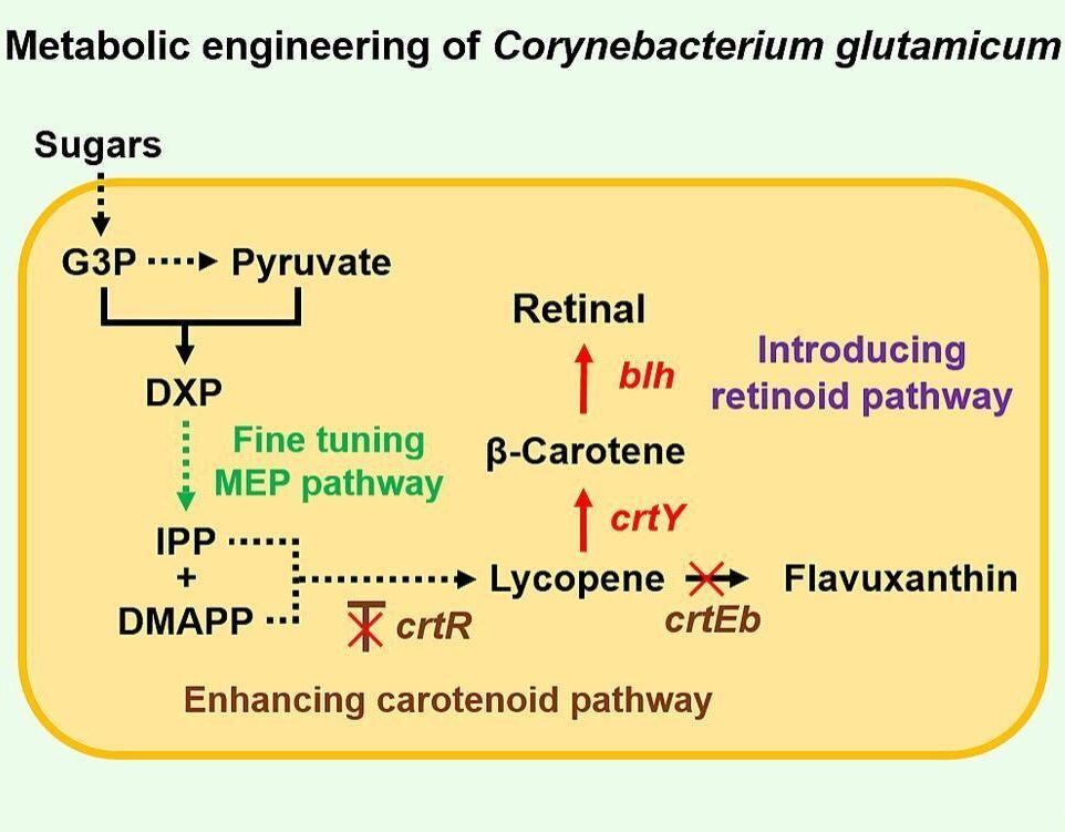 研究では、アミノ酸の工業生産菌として知られるコリネ型細菌(Corynebacterium glutamicum)を代謝改変し、リコピンからβ-カロテンを経てレチナールを合成する経路を構築した。