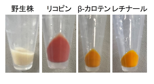 野生株、リコピン、β-カロテン、レチナール生産株の色(出典:金沢大学)