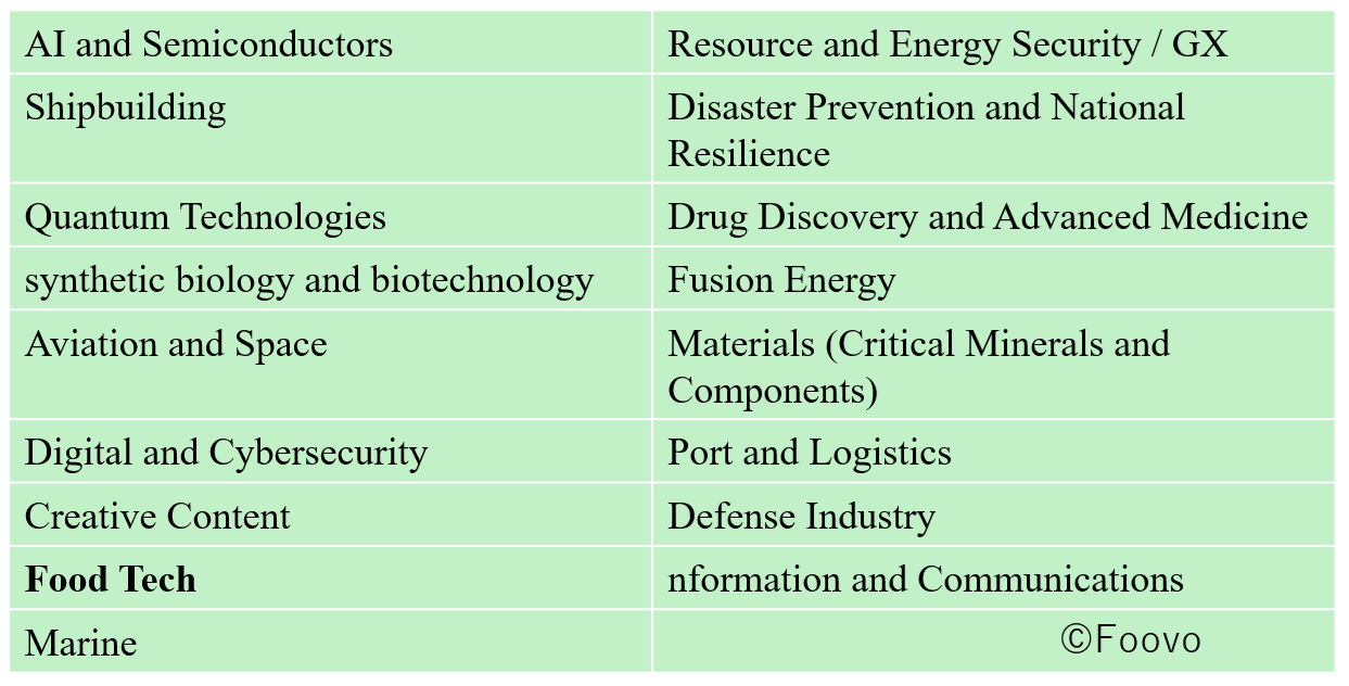 The 17 strategic sectors are listed below. The Minister of Agriculture, Forestry and Fisheries will oversee the food tech sector, and 12 experts have been appointed as members.