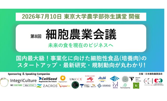 出典:細胞農業会議2026年7月10日、第8回細胞農業会議が東京で開催される。今年は「未来の食を現代のビジネスへ」を副題に掲げ、細胞性食品(培養肉)を中心に、スタートアップ、企業、研究者、行政らが集う。研究開発の現在地から社会実…